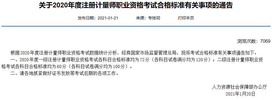 一、2020年度一级注册计量师职业资格考试各科目合格标准均为72分(各科目试卷满分均为120分);二级注册计量师职业资格考试各科目合格标准均为60分(各科目试卷满分均为100分)。