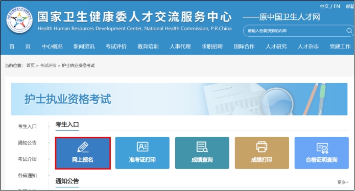 1.进入官方网站“卫生专业技术资格考试”或“护士执业资格考试”专区(下图为护士执业资格考试专区),点击“网上报名”。