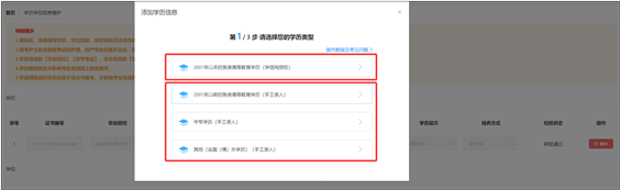 2.中专学历、2001年以前的各类高等教育学历和其他学历需手工录入;