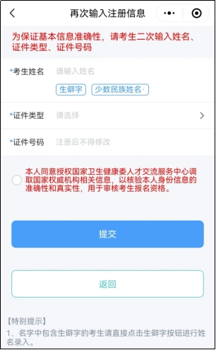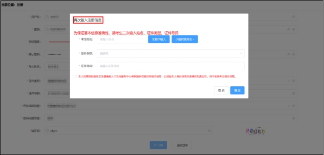 点击“提交”后,为了确保注册信息的准确性,需考生二次输入姓名、证件类型、证件号码。