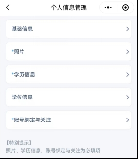 注册成功后系统将自动跳转到“个人信息管理”页面。考生需要先完成上传基本照片、添加学历、学位信息、账号绑定与关注,才能进行后续报名操作。