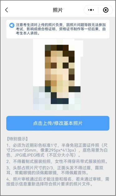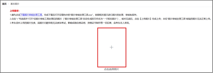 (3)返回系统上传照片界面,点击“+”号、选择处理后的报名照片(经审核处理工具保存后的照片文件名为“一寸报名照片”)上传。