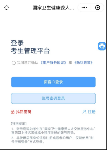 2.请考生妥善保管用户名、密码。注册后忘记密码的,可通过密码找回问题及答案修改密码,使用居民身份证注册的用户也可在小程序端使用人脸识别功能登录系统后修改密码;上述方法仍无法修改密码的,请联系所在考点考试管理机构。