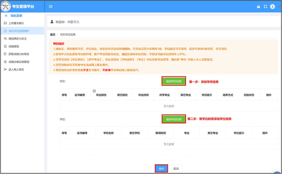 请仔细阅读特别提示内容,按要求添加学历或学位信息,添加完成后点击【保存】按钮,完成学历或学位信息的维护,最多可维护5条。