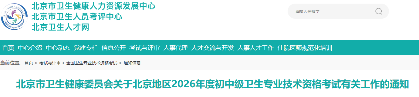 根据国家卫生专业技术资格考试办公室《关于2026年度卫生专业技术资格考试有关问题的通知》(卫考办发〔2025〕1号)精神,现就北京地区2026年度初、中级卫生专业技术资格考试有关工作通知如下: