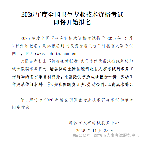 河北廊坊:2026年度全国卫生专业技术资格考试即将开始报名