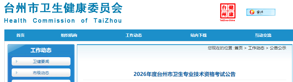 关于做好浙江台州市2026年度卫生专业技术资格考试公告