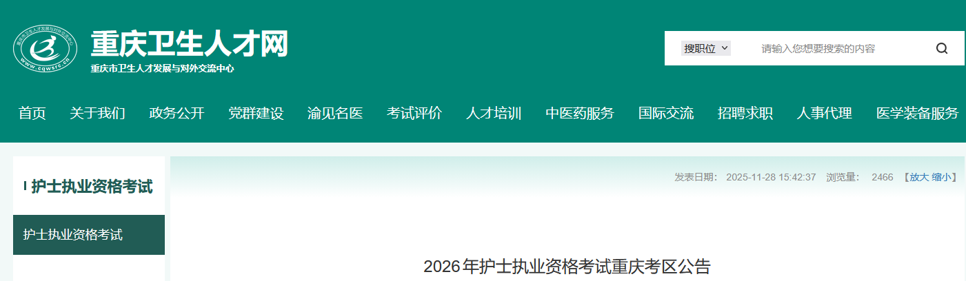 根据《护士执业资格考试委员会办公室关于2026年护士执业资格考试有关问题的通知》(护考办发〔2025〕4号)和《国家卫生健康委人才交流服务中心关于2026年护士执业资格考试考务工作安排的通知》(卫人才发〔2025〕75号)精神,现将2026年护士执业资格考试重庆考区相关事项公告如下: