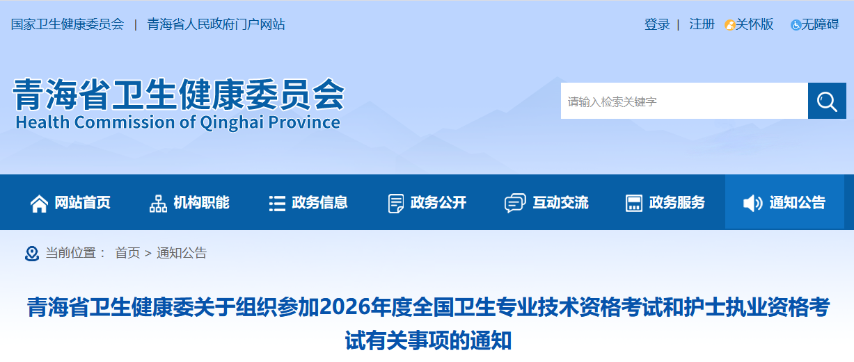 青海省卫生健康委发布《青海省卫生健康委关于组织参加2026年度全国卫生专业技术资格考试和护士执业资格考试有关事项的通知 》,整理内容如下: