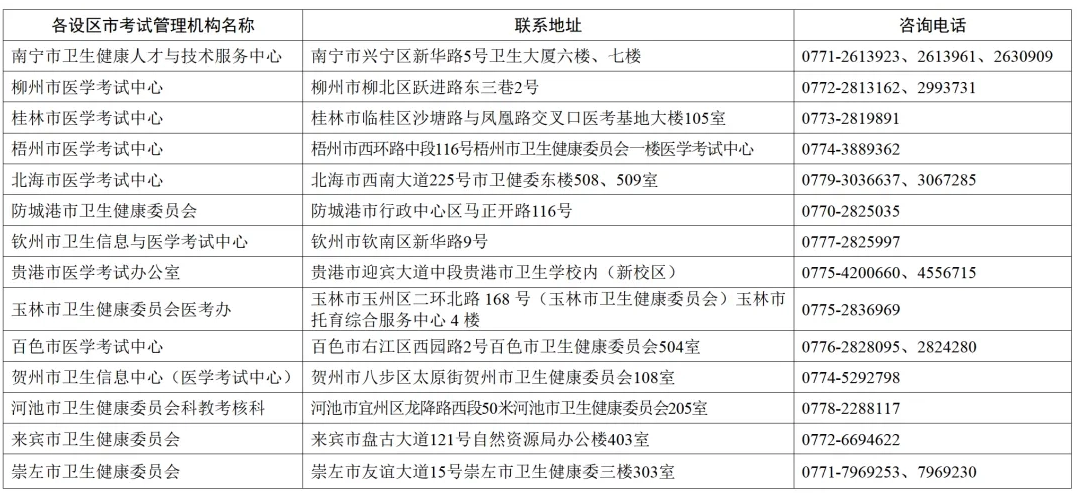 广西考区各设区市考试管理机构联系地址及咨询电话见附件2,各考生前往现场确认前请务必与所在设区市考试管理机构联系。