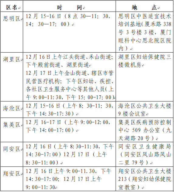 咨询电话:各区卫健局(思明5813735,湖里5715428, 海沧6583712, 集美6062155, 同安7020698, 翔安7888015),市医学交流与人才服务中心2136936、2138002。